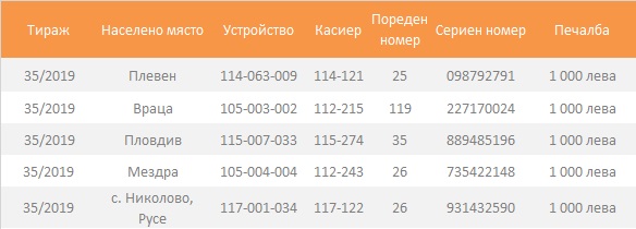 02.05.2019, 20:10Участници от Плевен, Враца, Пловдив, Мездра и с. Николово, Русе спечелиха тази вечер по 1 000 лева от „Тото 2 - 5 от 35“. Тези пет бонус печалби в 35-и тираж, по случай Деня на труда бяха определени чрез жребий от всички квитанции, участващи за играта „Тото 2 - 5 от 35“.